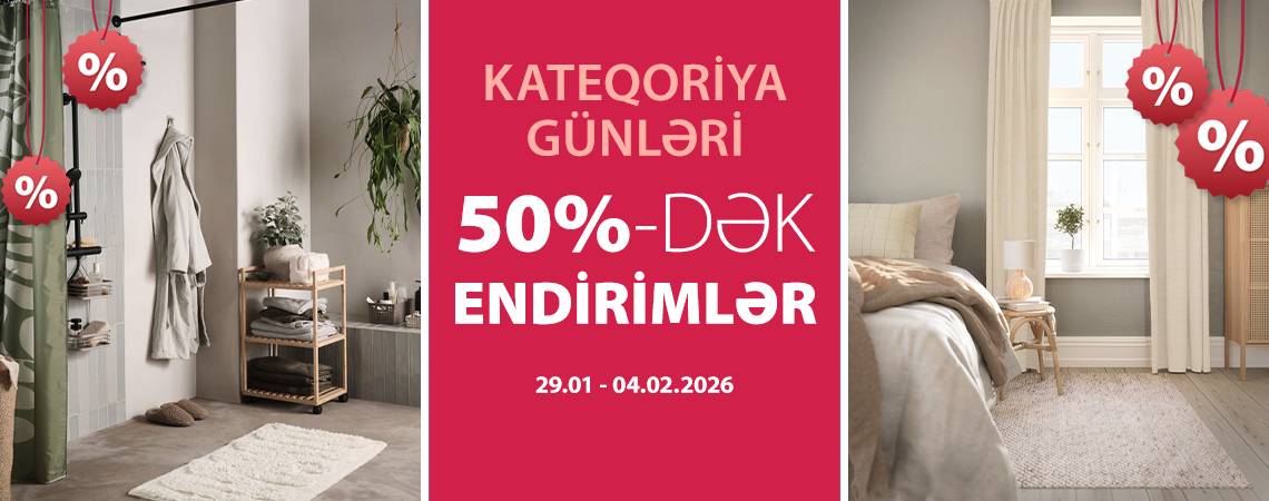 Geniş kateqoriya seçiminə 50%-dək endirim! 29.01 - 04.02.2026 tarixlərində əla fürsəti qaçırmayın: pərdələri, işıqlandırmanı, dəsmalları, hamam aksesuarlarını və bir çox digər məhsulları sərfəli qiymətlərlə əldə edin. *Aksiya “Əla qiymət” etiketi olan məhsullara şamil edilmir.
