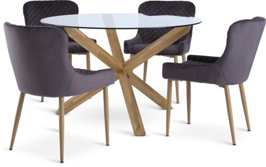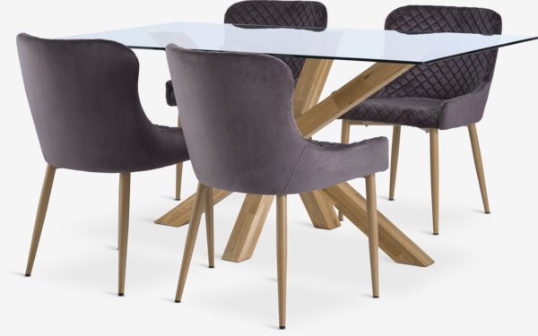 Masa: bərk palıd və temperli şüşə. 119 x 75 sm Stul: məxmər parça və polad.