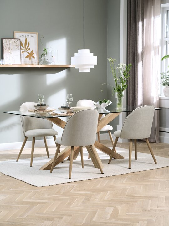 Masa: bərk palıd və şüşə. 90×160×75 sm. Stul: parça və polad.