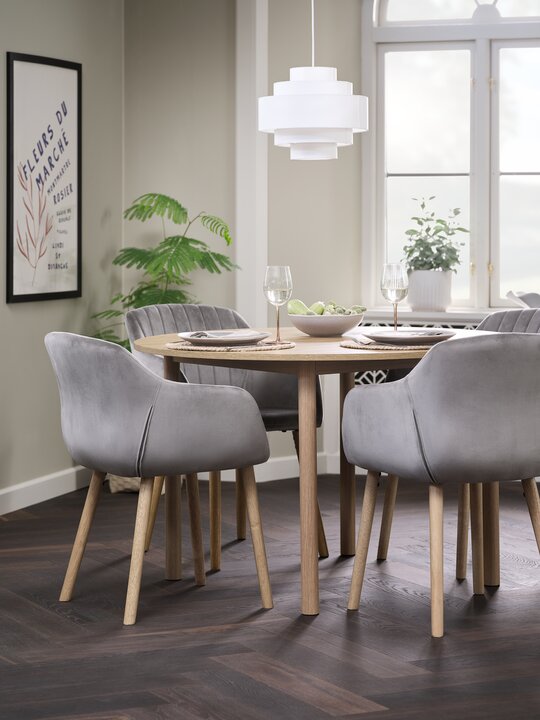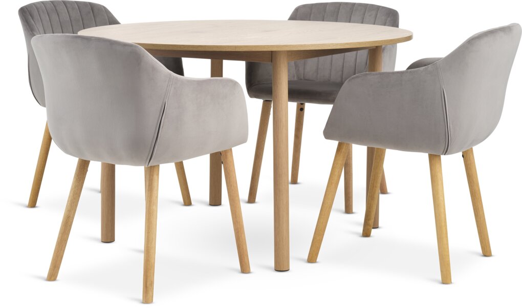 Masa: massiv ağac və MDF, Ø105 x H75 sm. Stul: parça və polad.