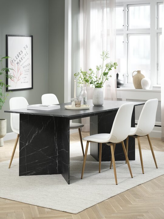 Masa: massiv ağac və MDF, Ø105 x 75 sm. Stul: formalaşdırılmış oturacaq və massiv palıd, sabit süni dəri yastıqla.