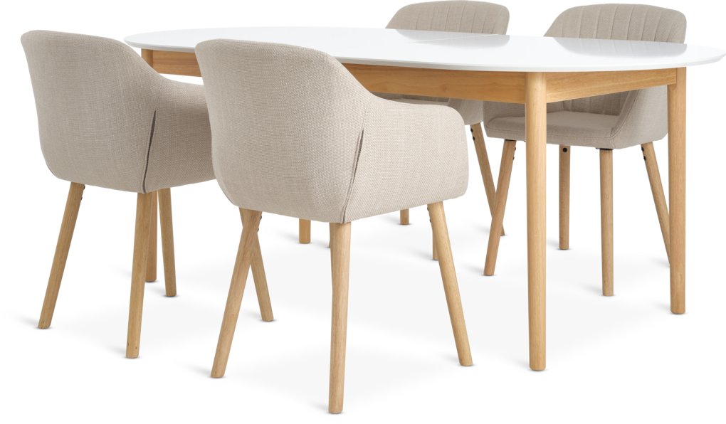 Masa təbii ağac və MDF-dən hazırlanıb. Stol altına yerləşdirilən 2 masa əlavəsi daxildir. Ölçülər: en 100 sm, uzunluq 200/240/280 sm, hündürlük 75 sm. Stullar parça və təbii ağacdandır