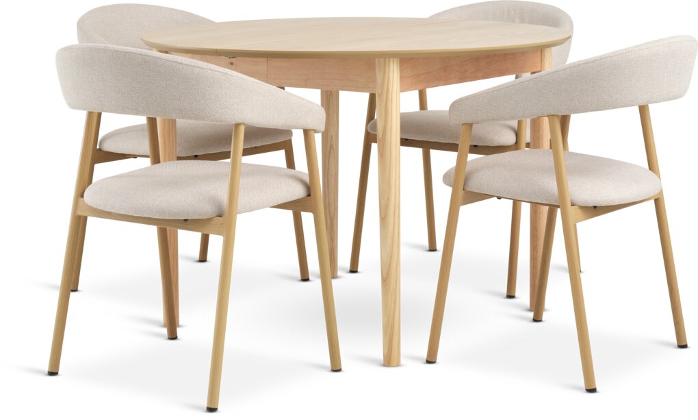 Masa təbii ağac və palıd furnirdəndir. Diametri 110 sm, hündürlüyü 75 sm. 2 əd masa əlavəsi daxildir. Açıldıqda ölçüləri: en 110 sm, uzunluq 200 sm, hündürlük 75 sm. Stullar parça və poladdandır.