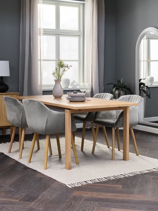 Masa bərk palıd və palıd fanerdəndir, ölçüləri 90 x 180 x 80 sm. Stul məxmər parça və bərk ağacdır.