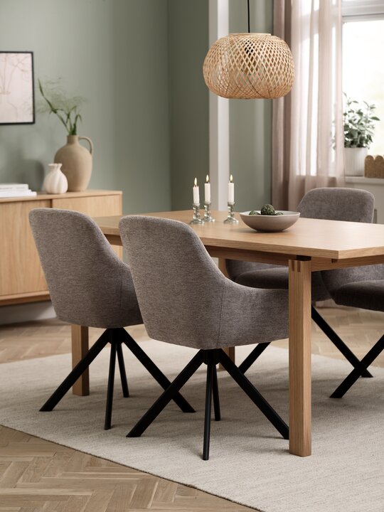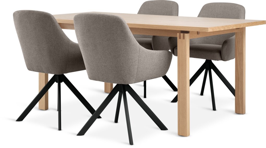 Masa: massiv palıd və palıd furniri. Eni 90 x Uzunluğu 180 x Hündürlüyü 80 sm. Stul: parça. Poladdan dönən baza ilə.