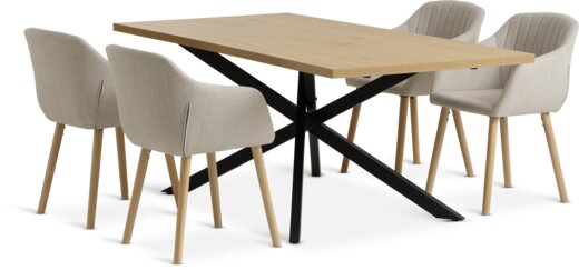 Masa: Deko kaplama və polad. 95 x 200 x 75 sm. Stul: Parça və bərk ağacdan.