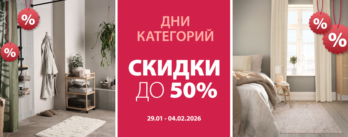 Скидка до 50% на широкий выбор категорий. С 29.01 по 04.02.2026 не упустите отличную возможность приобрести по выгодным ценам шторы, освещение, полотенца, аксессуары для ванны и множество других товаров.
