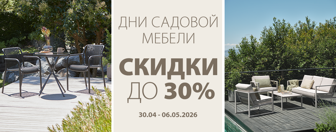 В JYSK стартуют Дни Садовой Мебели — ваша возможность создать идеальную зону отдыха с выгодой. ТОЛЬКО С 30.04 - 06.05.2026 СКИДКА 30% НА ВСЮ САДОВУЮ МЕБЕЛЬ Что вы можете выбрать для своего пространства • Обеденные зоны Прочные столы и комфортные стулья для семейных и дружеских встреч. • Лаунж-зоны Диваны и кофейные столики в современном скандинавском стиле. • Зона релакса Гамаки, шезлонги и подвесные кресла для полного отдыха. • Практичные решения Садовые ящики для хранения и зонты для защиты от солнца. Акция действует всего 7 дней Новинки сезона уже доступны Обратите внимание Акция не распространяется на товары с пометкой «Выгодная цена». Создайте сад, в который хочется возвращаться Превратите своё пространство в место отдыха, уюта и вдохновения — пока любимые модели есть в наличии.