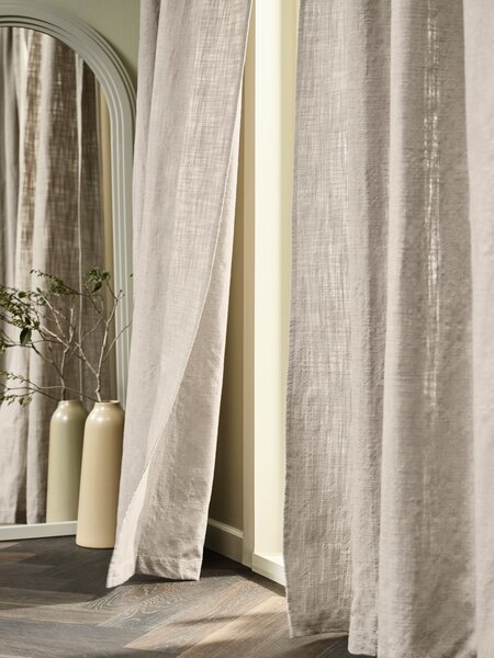 Льняные шторы ценятся за свой отличительный внешний вид, создающий уют и тепло. Как натуральный материал высокого качества, лен часто смешивается с хлопком или полиэстером для повышения прочности, при этом сохраняя ощущение роскоши. Натуральные льняные волокна приятно рассеивают свет, создавая мягкую и приветливую атмосферу в любой комнате. В качестве более доступных альтернатив некоторые шторы — сделанные из других материалов — намеренно имитируют вид льна.