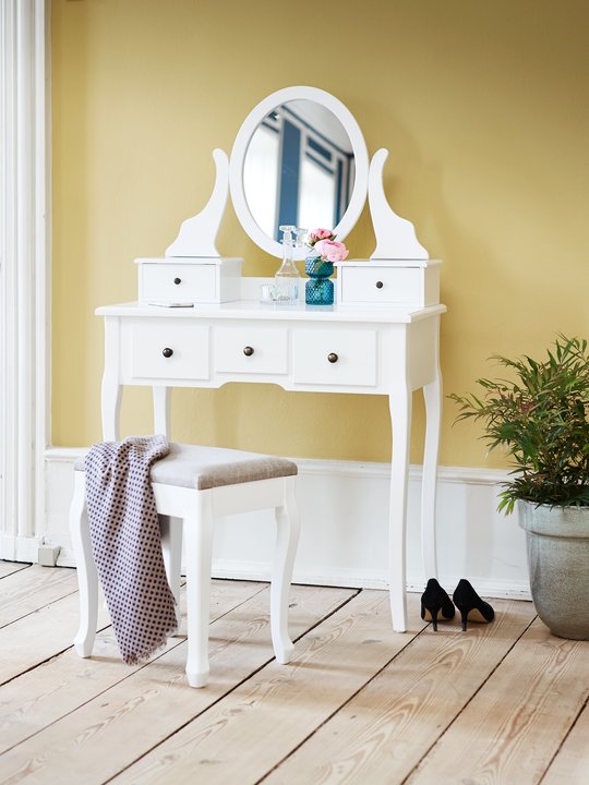 Туалетный столик из массива дерева и МДФ, 80 x 130 x 40 см. Пуф тканевый и из МДФ, 40 x 45 x 30 см.